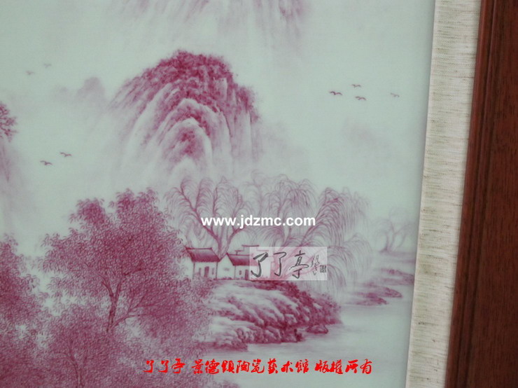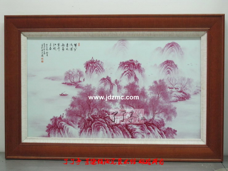 李映华是李镇生的女儿,我为什么要强调这一点,这是她重要的家学,我在景德镇第一次化大钱买的作品,就是李镇生的玛瑙红四条屏瓷扳:"春夏秋冬",每块板子都不大.十年多了,至今清楚地记得是37x17cm。我笫一眼就看入了神,那精、那细、那色、那美、那神,深深地震撼了我,一种传统的、难以言表的美感,怎么用一种釉表现出那千山万水、春夏秋冬,千变万化的美丽风景。真的很奇妙,我立马被折服了。从李映华的父亲手中求到了这个作品,从此对玛瑙红充满了向往和钟爱。