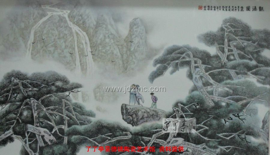 图中,削壁飞流,简而放,挺而苍,石台茂林,不拘一格,元气淋漓,至今犹觉其湿。台上三人,两文人对谈伫立,凝神飞瀑,童子携琴紧随其侧,细致分毫,神态完足。 小人物的设置,在於“点睛”,并增添了画面的人文情节:高山流水,知音何在? 赏佳画如读妙文,总让我们生出遐想,有着无尽的回味。
