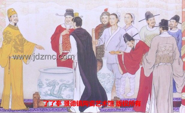 我国五千年的文化史所展现的各个朝代的物质文明与风俗习惯都存在相对差异。宋真宗是北宋第三代皇帝,无论时代、人物都有其自身历史个性。为了艺术真实地表现历史,在构思这幅画的同时,我不惜花费大量的时间与精力查阅了许多有关宋代史料,搜集了不少创作素材,研读了《宋史》、《市志略》、《陶瓷大全》、《瓷国及其高峰》、《瓷都纵横》等史籍、专著,做好了创作前的准备。一些资料中,宋代皇帝戴的往往是带翅的乌纱,表面看来与臣下大同小异,形象单调,缺乏个性特征。为了处理好这一细节,我反复查阅相关资料,仔细推敲历史画范例,终于从一幅表现“宋孝宗为岳飞一家平反”的画稿上,从一些影视作品中,找到宋代皇帝也戴无翅皇冠的先例,所以《景德瓷韵》中宋真宗的帽子与臣子的迥然不同,体现了人物特征与服饰的丰富多彩。史料记载,宋代昌南瓷器以“影青釉”的青白瓷著名,元代以后才出现“青花”,我没有忽略这一历史真实与细小的地方器物的考察查证,《景德瓷韵》中的龙缸、瓷瓶均为“影青”而不是“青花”。整个画面近20个人物,首先必须在人物组合上下功夫,我反复在小构图中安排人物,做到主次分明,参差错落,动态自然。在色彩稿中反复调整,使其色彩和谐相互映衬。我非常注重形象塑造和刻划,注重手势语言,每一个形象,每一个手势我都找人写生,力争准确生动,以突出人物的鲜明个性。画面中唯一有真实姓名的是宋真宗,我将他安排在左边的龙柱旁,通过薰香的烟雾虚化龙柱,作为他的依托,几乎所有人物的目光都投向他,以突出他的主人公地位。与他议论龙缸的或许是宰相寇准和年轻的皇家贵族。我有意在画面的视觉中心安排了一名接旨的浮梁县官和两名瓷工,以强调创作辉煌陶瓷文化的来自昌南镇的代表,以表现景德镇冠名的光辉历史瞬间。陶瓷画中,人物画大了会显得单薄,画面很空,我借鉴古代陶瓷画图案的装饰手法,有机地将皇帝龙袍、大臣官服、陶瓷上的纹饰与皇宫薰香时烟雾缭绕中雕梁画栋上的图案组合在一起,相互呼应,丰富了画面内容。在色调处理上,我定格为表现宫殿的金碧辉煌,统一在金黄调子中,又不失色彩的丰富性。