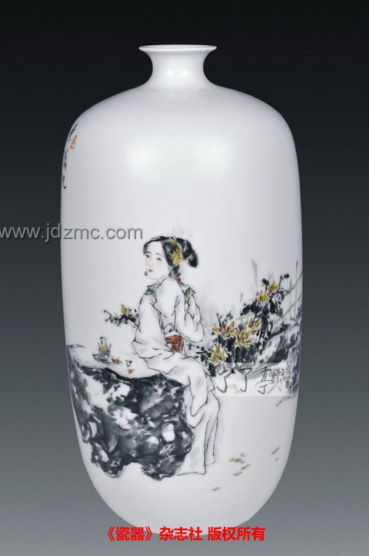 瓷瓶《李清照词意图》 作者:俞暄 高:42cm口径:6.5cm 《李清照词意图》 作者:俞暄 俞暄,1969年生,江西婺源人,江西省高级工艺美术师。其仕女陶瓷作品高雅、淡定、悠然,不乏细腻和轻柔。