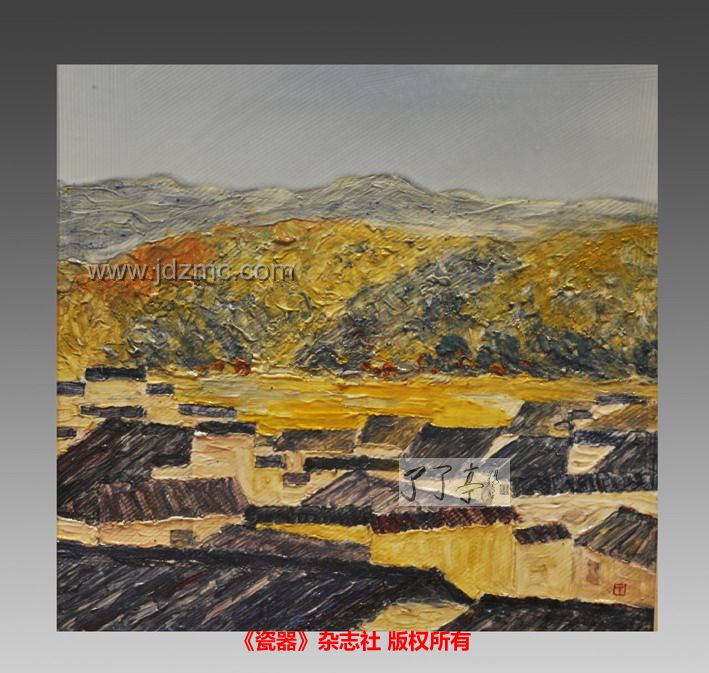 釉上彩《故乡》 作者:丁传国 40cm×40cm 《故乡》作者:丁传国 丁传国,1977年5月生,现任景德镇陶瓷学院陶瓷美术学院讲师。江西省美术家协会会员。作者独创作高温釉彩陶瓷本体绘画,以风景为表现对象,将画的意境与陶瓷材质的美感充分融合于一体,形成作品独特的艺术风格。