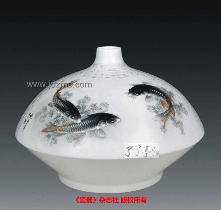 釉上彩瓷瓶《畅游》 作者:鲍丰芹 高:27.3cm口径:5cm 《畅游》作者:鲍丰芹-爱心艺术家捐赠残联作品 鲍丰芹,山东日照人,毕业于景德镇高等专科学校,高级工艺美术师。其作品应型布局,构图严谨大方,富有灵动之气。