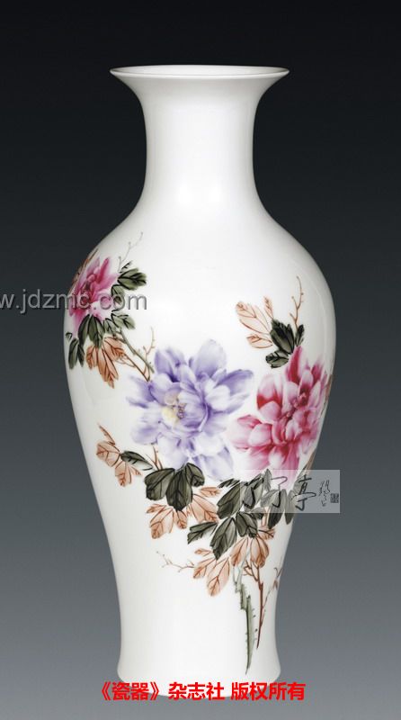青花瓷瓶《富贵牡丹》 作者:屈兰凤 高:46cm口径:13.3cm 《牡丹富贵》作者:屈兰凤 屈兰凤,陶瓷艺术家。作品细腻生动,构图巧妙,独具个人风格。