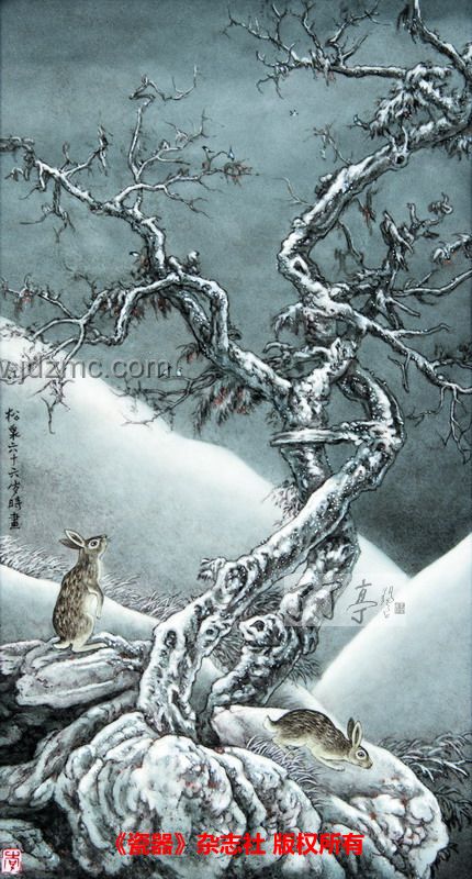 釉上彩《玉兔迎春》 作者:李松泉 59cm×33cm 《玉兔迎春》作者:李松泉 李松泉,1945年5月出生于景德镇,高级工艺美术师,任职于景德镇壁画公司,擅长花鸟、动物,兼长人物。其作品构思新奇美妙,构图不拘成法设色切合环境和审美意象之特性,风格清雅、活泼,饶有情趣。