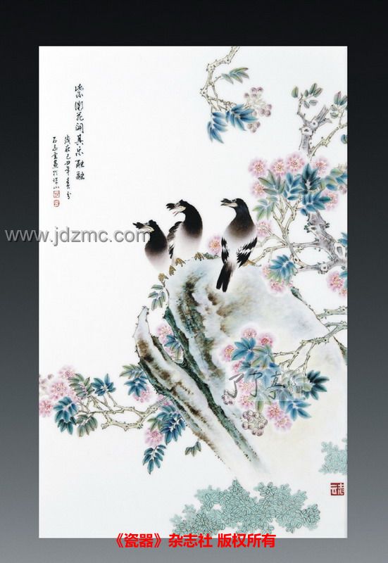 釉上彩瓷板画《紫藤花开其乐融融》作者:石志云 53cm×34cm 石志云,1965年出生,素描、水粉、工笔国画功底深厚,其作品构图清新,色彩丰富,独具匠心。