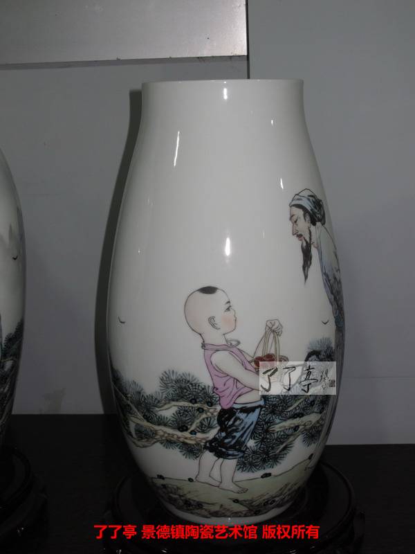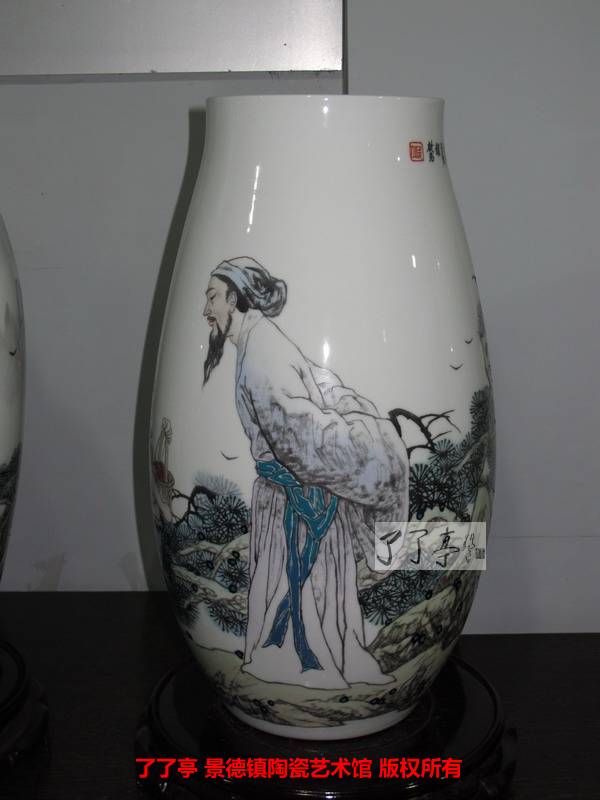 在晚霞的辉映之下,在山岚的笼罩中,童子东篱,遥望南山,此时情味,何其深永!邱启先的作品的一大特色就是朴厚,感觉和情理浑然一体,不可分割,是一种借助瓷器绘画回归自然的表现。