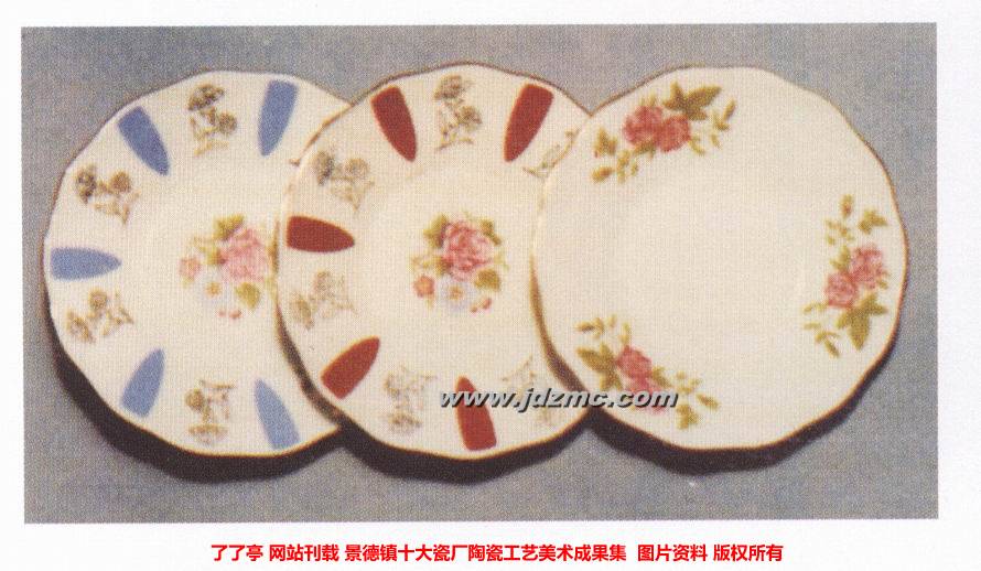 4.5寸荷口碟、圆口碟是新华瓷厂20世纪70 年代至20世纪末的主导出口产品,年产销量都在1000万件以上,主要销往伊朗、伊拉克以及巴基斯坦、科威特、前苏联等国家,装饰手段主要以釉上为主,花面有印金赤红、金镶玉、子弹头、各式朵花等。新华瓷厂生产的4.5寸荷口碟、圆口碟,以其美观大方的器型设计,产量大,质量高,花面清新、简洁,曾经是景德镇出口创汇的主要产品之一。