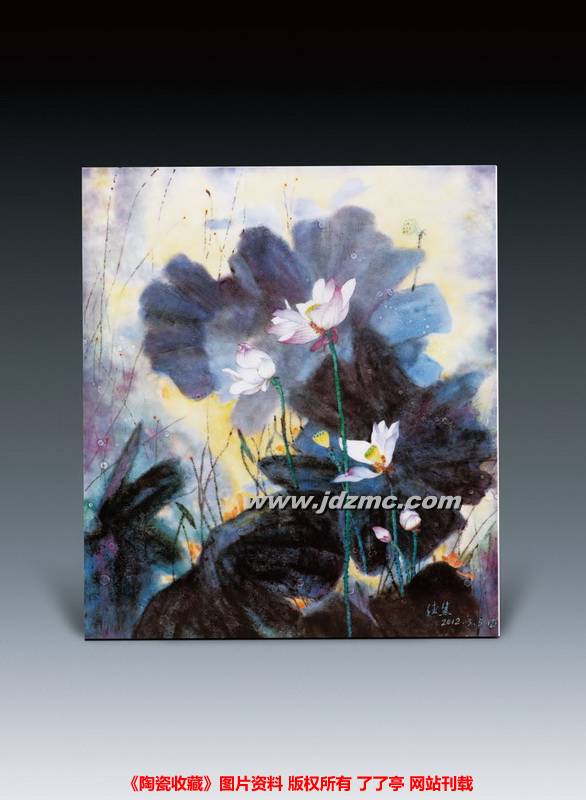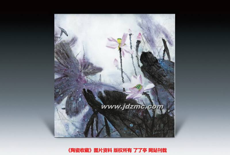 对荷花的喜爱表达了一个民族的人文情怀,对荷花的痴迷更源于中国文人对它人格化的立意。以一种大写意的笔触表现荷叶摇曳起伏的姿态,并充分利用水料和油料的互斥特性形成丰富泼辣的肌理效果,体现了作者对釉上彩料自信而奔放有度的驾驭能力。荷花以精细的笔触描出,和大面积重颜色的荷叶形成对比,展现出荷花多姿、清新高雅、出污泥而不染的高贵品格。整幅作品色彩对比强烈、层次丰富,逆光处理难度颇大,但别具新意,给人一种似曾相识又耳目一新的视觉感受。