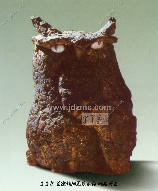 静观(陶雕) 猫头鹰站在高高的树上,正对着黑暗的一面静静地观察,机警严密地监视宫人虫的活动,一旦发现老鼠等坏蛋,它们就别想逃走。作品直接用车床上车下来的铁屑洒在打成泥饼的耐火材料上。铁屑熔化后,有的地方有,有的地方无,斑斑驳驳的变化十分丰富,产生特殊的装饰效果。这件作品追求原始意味,自然天成,是泥板成型的现代陶艺的经典型作品,粗犷而又大气。眼睛是白瓷做的,与耐火泥的身子形成强烈对比,更感到炯炯有神。这件受到高度评价的作品现为作者的镇馆之宝。
