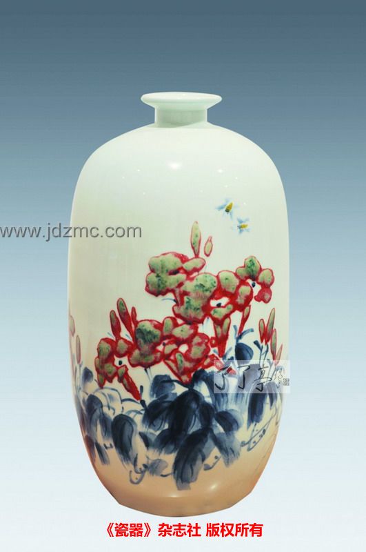 青花釉里红《牵手》 作者:黄焕义高:45.5cm口径:8.7cm 《牵手》 作者:黄焕义 黄焕义,1960年生,现为景德镇陶瓷学院陶瓷美术学院教授、硕士生导师,享受国务院特殊津贴专家。作品《牵手》表现人们之间手牵手、心连心、相互关爱这一主题,作者以写意的手法,青花釉里红的形式,描绘出牵牛花的意境及寓意。