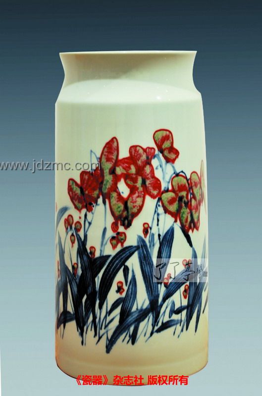 釉上彩《蝴蝶兰》 作者:詹伟 高:41.7cm口径:18cm 《蝴蝶兰》作者:詹伟 詹伟,江西婺源人,现为景德镇陶瓷学院陶瓷美术学院副教授。作品运用中国写意的技法结合陶瓷秞下装饰,使得作品笔意酣畅,其釉里红发色红中有绿,艳而不俗。具有中国传统审美的雅致和东方气度。