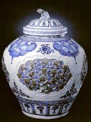 青花釉里红镂雕盖罐,通高41cm,口径15.5cm,足径18.5cm。 罐直口,短颈,溜肩,鼓腹,圈足,砂底无釉。胎体上薄下厚,胎质细腻,青花色彩浓艳,釉里红略暗。附狮钮盖。 罐盖顶堆塑坐狮钮,钮下绘青花莲瓣纹、卷草纹、回纹各一周。罐身、口沿绘青花缠枝花纹、卷草纹各一周。肩部饰下垂如意云头纹,云纹内绘青花水波纹托白莲,云头纹间隔折枝牡丹纹。腹部四面堆塑双勾菱形开光,内镂雕山石、牡丹等四季园景,其中釉里红绘山石、花卉等,青花绘花叶,纹饰有浮雕效果。腹下部饰青花折枝莲花,与云头纹相对应。腹的底部饰卷草纹及变形莲瓣纹,莲瓣纹内绘倒垂宝相花纹。罐型丰满浑厚,纹饰层次鲜明,综合绘、镂、塑、贴等多种技法。青花、釉里红互为衬托,红、蓝交相辉映。 青花釉里红瓷器创烧于元代。青花的呈色剂是氧化钴,呈色稳定;釉里红的呈色剂是氧化铜,极易挥发,对窑室的烧成气氛要求十分严格。元代景德镇工匠创造性地将二者珠联璧合地施于同一器物上。这一新的釉下彩品种的出现,是元代瓷器生产技术进步的重要标志。 此罐1965年出土于河北省保定市元代窖藏,为近似的两件之一,是元瓷中的珍品。 (撰稿人:黄卫文) |