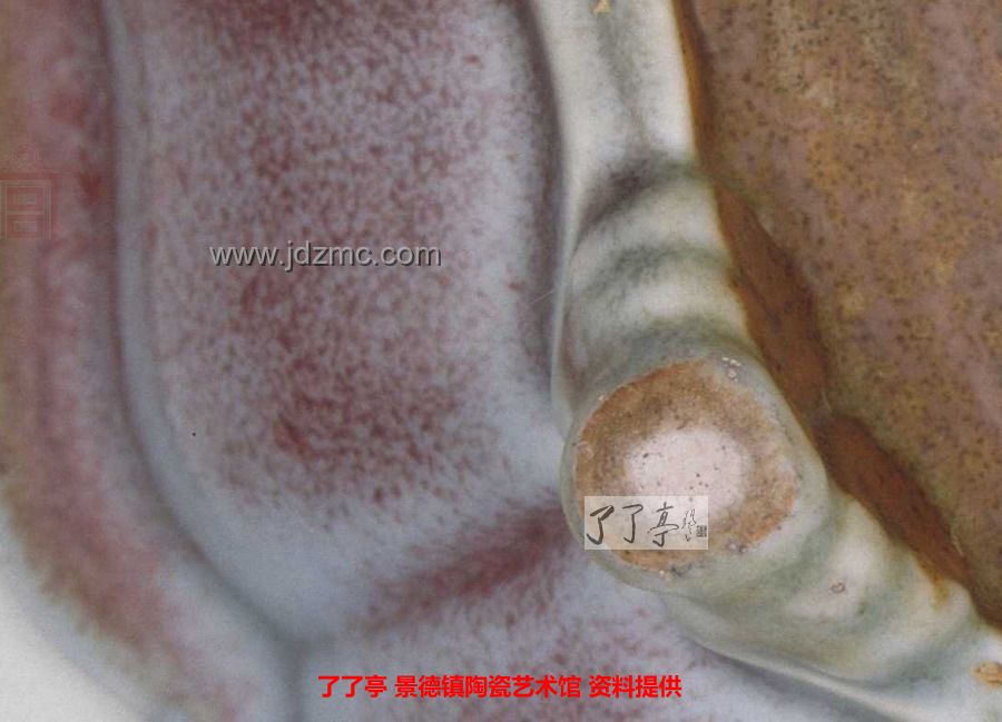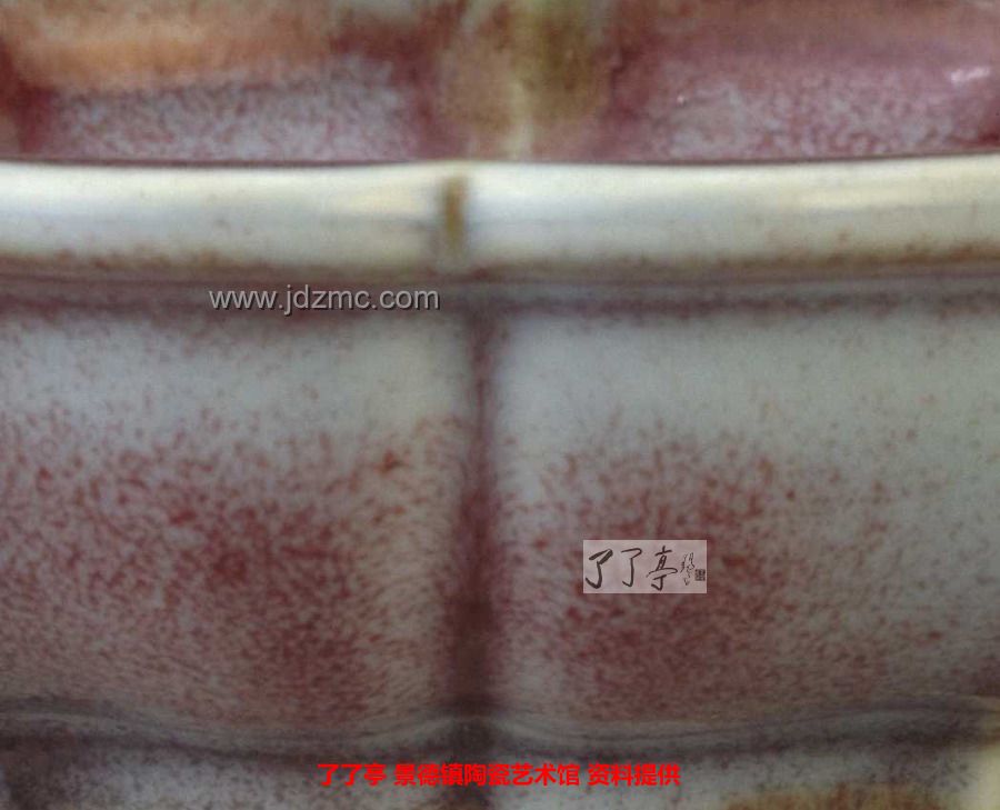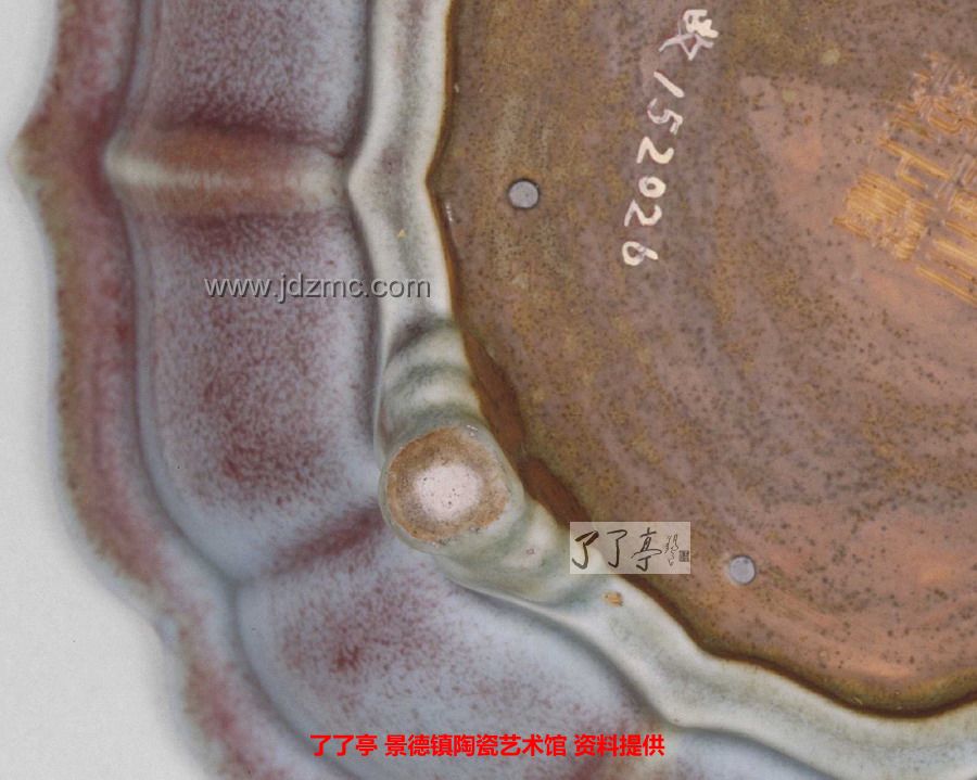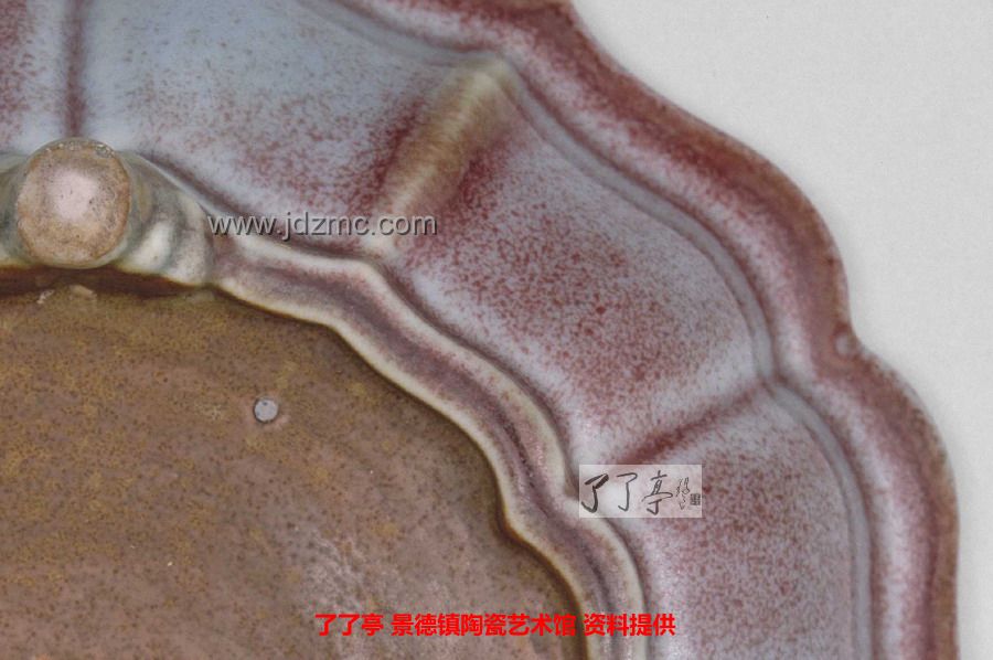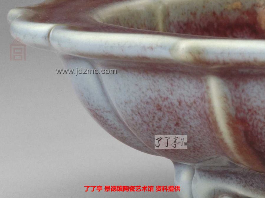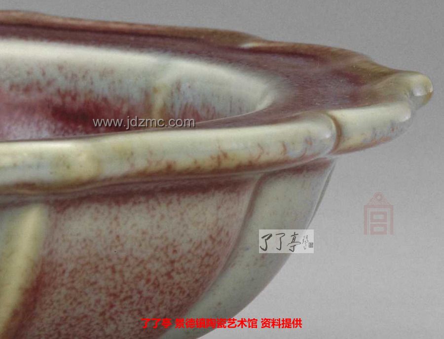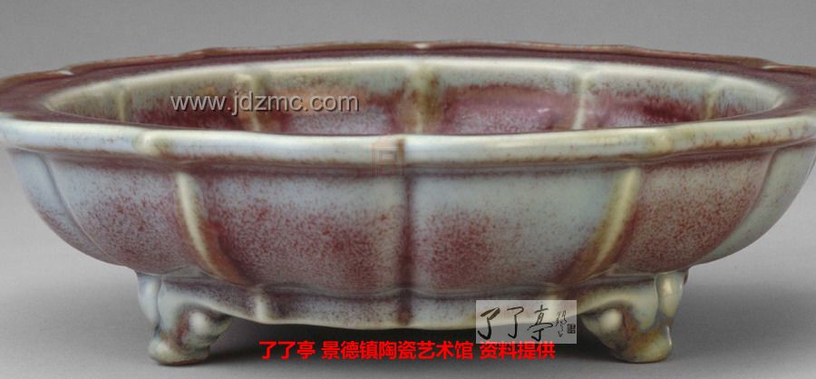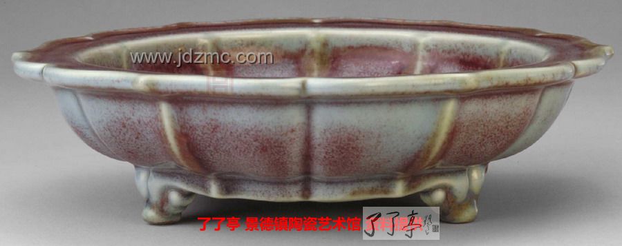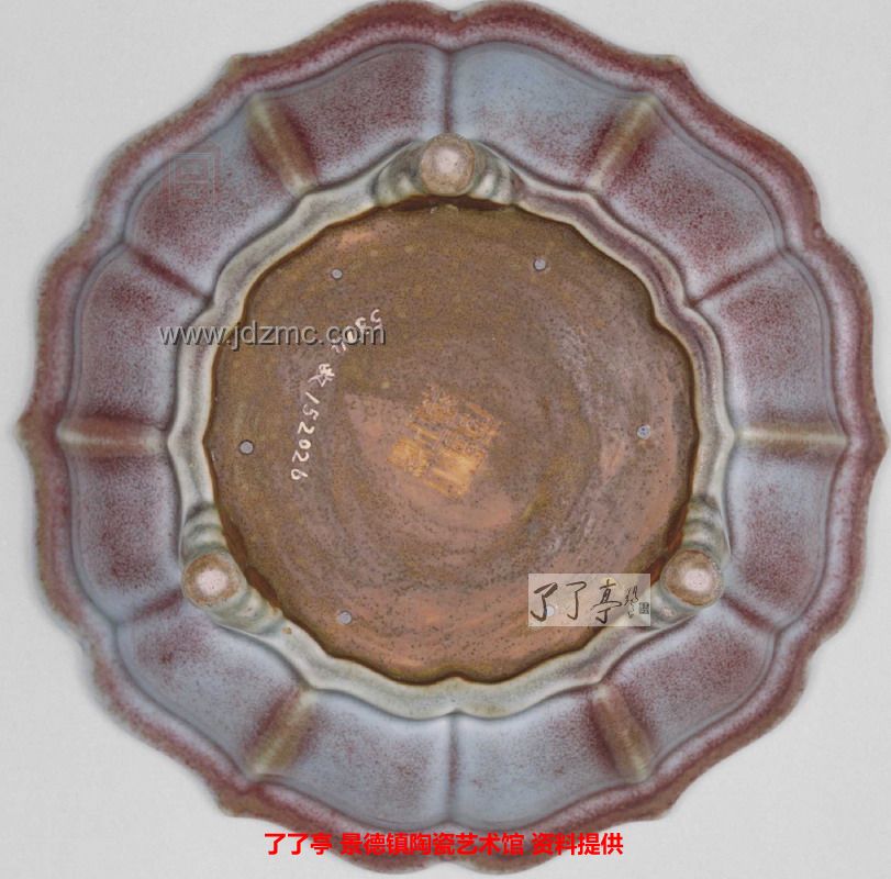 仿钧釉菱花式花盆托,高6.6cm,口径24.3cm,足距10.2cm。 盆托折沿,通体六瓣菱花式,下承以三个云头形足。里外满施仿钧釉,底刻阳文篆书“大清雍正年制”三行六字款。 此器造型、釉色皆仿宋代钧窑式样,形体端庄古朴,釉层晶莹肥厚,釉面色泽雅致。