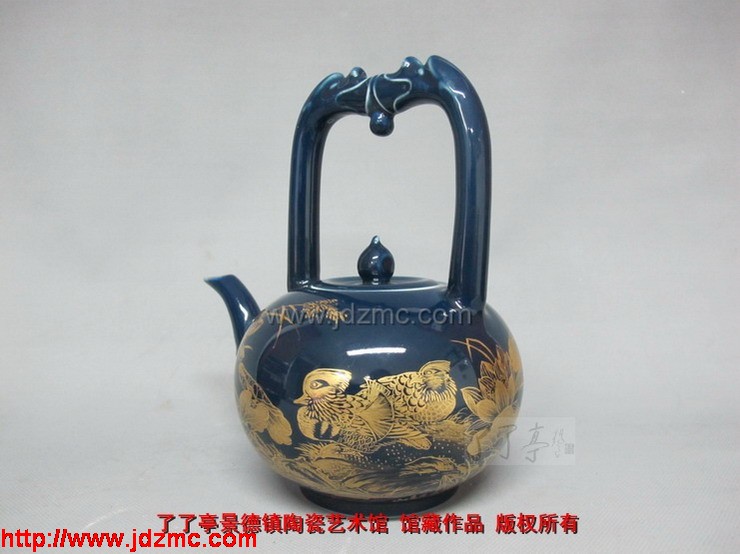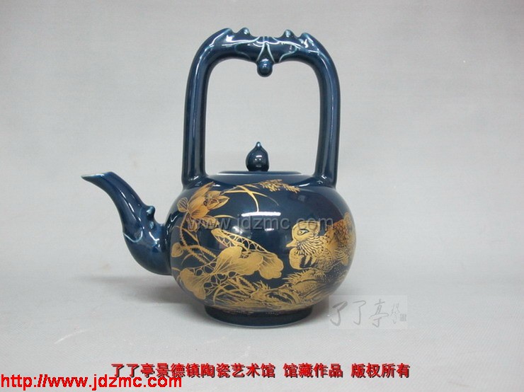 祭蓝描金无疑是众多陶瓷艺术种类中,最显高贵的画种之一。其深沉古典的颜色,深蓝与纯金的结合,使它显得既神秘又优雅。这件祭蓝描金的作品,高温色釉的全手工茶具,为求精致,万里无云,百余件瓷胎经过徐国明老师的一下午精心挑选仅存硕果一套,于是徐国明老师更加精细对这五件套瓷胎进行了优秀的设计。主壶画面的鸳鸯,以及四把梅兰竹菊的茶杯,古典精致的样式和高超的绘画工艺,做到了手工技艺无比高贵华丽的效果。工笔金彩,衬以深蓝,高贵厚重又有着奇特的文雅气息。遥想,此壶一身古韵,几乎能吸引任何人的目光,随着茶水注入洋溢着一缕缕淡淡的茗香,然后,将壶盖轻巧合上,定格了世间的时光。了了亭·李申盛/文