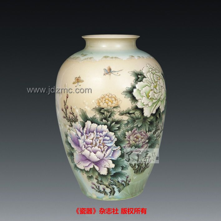 釉上彩瓷瓶《花开富贵》 作者:程进 高:36.5cm口径:13.3cm 《花开富贵》作者:程进 程进,1971年出生,投身艺术二十年,其雕刻作品充分展示了泥、火、手工的巧妙结合,显现了手工的精巧材质的美和艺术的感染力。