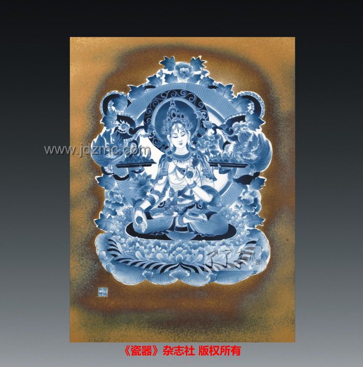 综合装饰瓷板《佛光普照》 作者:程聪 75cm×55 cm 《佛光普照》作者:程聪 程聪,1985年出生,江西景德镇人,省二级技师,作品主要以佛教题材青花人物为主,妙音寂静,画入人心,所造之大士法相,一慈一悲,现画笔底。