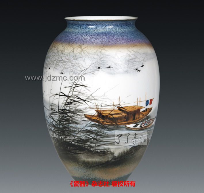 釉上彩瓷瓶《鄱湖之晨》 作者:刘金明 高:40cm口径:17.6cm 《鄱湖之晨》作者:刘金明 刘金明,1979年出生于鄱阳,青年陶艺家。其作品工笔细腻,线条流畅,构思巧妙,章法严谨,意境深远。