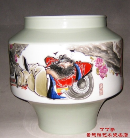 [作品欣赏之钟馗醉酒] 这幅《钟馗醉酒》画得十分生动有趣,把钟馗的酩酊醉态,刻划得淋漓尽致。你看他坐在那里烂成泥团,脑袋耷拉下来埋进了胸脯,头胸肚三位一体,缩成一团。再看身旁的那酒坛子,横倒了下来,剩酒从坛子里汩汩流出,流成一地。更为有趣的是,人事不省的钟馗,我们猜想他还闭着眼睛说醉话:“鬼敢来焉?!”真是一幅绝妙钟馗醉酒. 作品虽然有褒有贬的表现钟馗醉卧酒坛、酣然大睡的情景。但是钟馗是刚正不阿的文人,虽然长相丑,而心地却不丑陋。从人物面部表情的刻写,那紧锁的双肩、沉睡的双眼、卷翘的胡须、高高的鼻梁,从脸部神态中将其正义感的心境表现得淋漓尽致。 (追溯陶瓷文化艺术创作的源头,使大家更了解陶瓷创作典故的背景与来源。了了亭·景德镇名瓷在线整理编辑) |