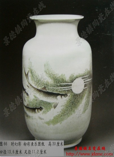 民国时期饰有动物纹饰的器物较多,不仅有陈设瓷、日常生活用瓷、文房用具,而且大量的瓷板亦以动物为题材,这里所讲的是狭义上的动物,即以走兽和水生动物为主。民国动物题材广泛,有龙、凤、狮子、虎、鹿、牛、马、羊、犬、猴、兔、猫、松鼠、四灵、鱼、蟹、蛙等。与民国人物题材不同的是动物纹饰均为传统题材,因明清两朝,特别清朝动物纹饰题材之广匪夷所思,凡地上跑的,水里游的皆可入画,并且还有杜撰出来的动物,故民国动物纹饰创新极罕。但在构图及画法上却有继承、有创新。继承者多表现在构图形式上,如明清之团龙、团凤等。创新者多表现在绘画技法上,如走兽皮毛皴擦的质感,并以此形成其典型的时代特征。 民国时期从事动物题材装饰的艺人不及从事花鸟、人物、山水题材装饰的艺人多,艺术水平有高下之分。大体上可以分为以下几种:首先是以“珠山八友”为代表的艺人,他们多成名于1930年以前,具有较高的艺术造诣,作品多为达官贵人所定购。如邓碧珊所绘鱼藻设色柔和,笔法工细人微,具有明显的日本写实画风。又方云峰的鹿、猫,工而不板,于传统笔墨中加入西洋素描技法。再张志汤的马,用笔工整,虽多仿郎世宁而别有新意。他们的作品,代表了民国时期瓷器动物装饰的最高成就。其次是成名略晚于前者,或承家学,或得名师真传的艺人,如得邓碧珊真传的张沛轩,所绘游鱼不逊乃师,又如一生画虎而有“毕老虎”之誉的毕渊明,有“鱼痴”之谓的时幻影等,他们的作品亦有很高的艺术成就,惟名气略逊于前者,其作品也可人民国一流之列。再次是一般瓷业公司及有实力的铺号仿前朝之作,虽纹饰构图及画法没有新意,但绘制精湛,加之胎釉细腻,亦代表了民国时期瓷器装饰及烧造水平。如南昌新中华出品的团龙团凤餐具。又如一些署前朝款识的仿古器物等。最后是一般红店出品的日常生活用瓷,纹饰绘画虽不精湛,但较少粗制滥造之作,如青花龙凤纹碗、盘,红彩狮子纹帽筒等。民国时期动物纹饰从整体水平上看,艺术成就高于同时期的山水及人物纹饰。 民国时期,鱼藻纹较为盛行,这与人们企盼丰衣足食、年年有余的心理有关。以邓碧珊的艺术成就最高。其弟子张沛轩及时幻影等人亦有神来之笔。 图63为邓碧珊青花粉彩鱼藻纹笔洗,外口沿以蓝料绘回纹及如意云头纹,近足处绘有变形蕉叶纹,足外墙绘八组朵花卷草纹。洗心正中为一轮淡彩月影,下方两尾游鱼在追逐水中月影,一汪水草以赭墨勾描,上罩以水绿。全图虽无一笔水波涟漪,但有池水如境的情趣。右上墨书“邓碧珊画”及红彩朱文“碧珊”方章一枚,底有红彩朱文“汪氏家藏之珍”篆款。 图64为邓碧珊粉彩鱼跃生趣图瓷板,构图疏朗大方,正中为一尾由上而下翻转的游鱼,中间为一丛碧草,—卜部水藻之中有五尾游鱼昂头上跃,动感极为强烈。游鱼以浓淡不一的墨色勾描渲染,鳞光点点,极富层次,下方游鱼的色彩亦有浓淡之别,从而表现出远近层次。水藻勾墨染绿,笔调细腻,笔趣优雅。左上墨书“生趣都从笔底开,翻身一跃胜春雷。天公有意施霖雨,为济西江涸泽来。时在己巳舂月铁肩子邓碧珊画于珠山客邸”及红彩白文“邓氏”方章一枚。鱼纹因“鱼”“余”谐音,故为历代瓷器使用最多的纹样之一,尤其是明清两朝历代均有表现,但表现力及艺术成就均不及邓氏。即便是素有盛誉的明嘉靖五彩鱼藻纹盖罐,也只能是以绘画的线条清晰,色彩的亮丽,刻画的细腻著称,而不及邓氏鱼纹之活,格调之清新,而晚清鱼纹则以鱼鳞密布,类如剪纸为特征,艺术成就去邓氏甚远。邓氏自幼生长在鄱阳湖畔,对各种鱼类的生活习性及形态特征极为了解,甚至水藻的粗细也因急水与静水而有不同,小河小港才有浮萍,而鲤鱼的鳞片从头到尾大致有36片等。所以,他笔下的鱼藻真实、生动而活泼。 图65为张沛轩粉彩鱼藻图瓷板,构图与乃师常见的上下法不同,采用左右构图法,两尾鳜鱼在浮萍水草间戏耍,左边一尾体态轻盈,右边一尾神态沉着。鱼鳞以浓淡不同的墨点虱成,虽明暗层次不甚清晰,但随意之中见质感。赭墨勾勒之外以浅绿渲染,虽无涟漪,但水草游鱼尽得碧池之韵味。左上方墨书“不风仍荡荡,无水亦悠悠。寄语烟波里,渔翁莫过求。张沛轩画于昌江客邸”及红彩白文“画”、“印”方章二枚。 图66为时幻影粉彩鱼乐图瓶,画面采用横带式构图,清晰的月影映在水草中,几道泛起的涟漪将水草荡起,几尾游鱼追逐月影而来,尾鳍翻摆,游姿优雅。线条柔婉飘逸,极富动感。底红彩方框“陶雅斋”篆款。时氏有“鱼痴”之称,所画游鱼,或红彩,或墨彩,皆具有清淡高雅之风。 图67为张洛山粉彩鱼藻图瓷板,构图有邓碧珊之风,绘有一尾鳜鱼两尾鲢鱼。鳜鱼由上向下游来,一鲢鱼尾鳍摇摆向上游去,似乎在追逐水中的月影。另一尾鲢鱼匿在水草中。右下角为大片面的水草,水面上有浮萍点点。此作鳜鱼墨笔鲺鳞,鲢鱼晕色丰富,锦鳞片片。与邓氏不同的是水面以淡彩染水波涟漪。左上方墨书“巨口细鳞状如龙,桃花三月正肥初。天涯怀得家乡味,除却松江总不如。张洛山画”及红彩朱文“洛山”方章一枚。“除却松江总不如”句巧借晋人张翰在洛阳作官,见秋风起,想念家乡苏州味美的鲈鱼,便弃官回乡的典故,读来虽有画外之音,但颇有品味之处。 图68为何洁一粉彩鱼跃图瓷板,构图有邓氏之风,绘画工细。左