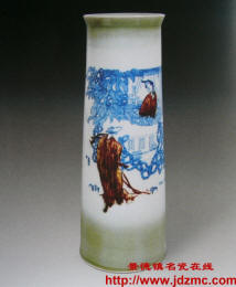 青花色釉综合装饰《红楼梦》150件瓶,巧妙利用各种技法之长,具讲诗画、金石为一体,来表现仕女优美的动态和情思,线条细逸、神态柔美,获全市首届