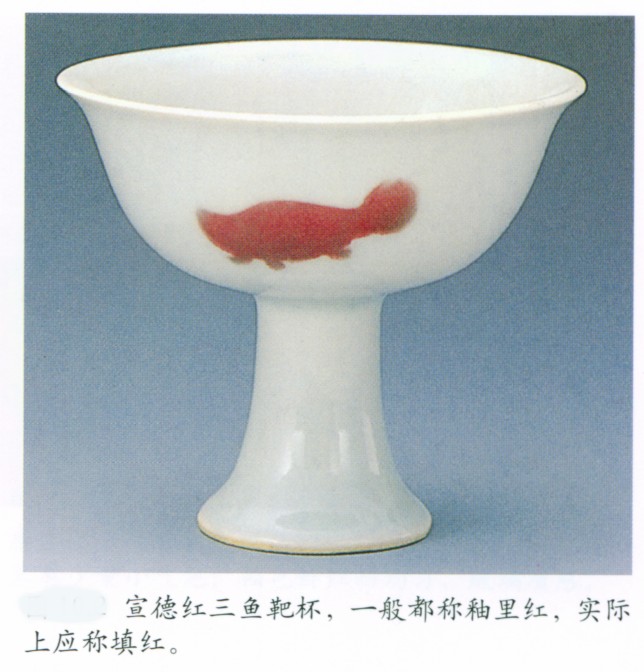 什么叫“填红”?现代文物界对明清时期烧制的红三鱼、红三果一类产品都称之为“釉里红”。实际上,这类产品在制作工艺、化学组成、显微结构以及外观特征方面都和釉里红不同而与祭红相同。因红釉是在剔去白釉后再填进去的,建议改称为“填红”。古代文献上也把这类装饰称之为祭红或宝烧等。如《景德镇陶录》卷三’做古各釉色·宣窑宝烧条目下有“三鱼三果三芝五福四祥’等记载。《景德镇陶录》卷五·宣窑条对宣德红鱼靶杯有如下记载:“宣厂造祭红红鱼靶盂,以西红宝石为末人釉,鱼形自骨内烧出,凸起宝光、汁水莹厚”等语。