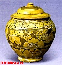 黑瓷也是磁州窑产品的大宗,这类产品的造型以罐、碗、瓶为主,也有盘、壶和玩具。胎质粗糙,胎色黄褐,胎体厚重,釉层较厚,黑色纯正。大多数器物是里施满釉、外施半釉,也有些里外均施半釉,有些罐类内壁施釉仅过口沿。黑釉碗除纯黑者外,还有一些油滴、兔毫、玳瑁斑等窑变装饰。绿瓷产量不大,大都是金代产品,主要造型有盆、盘、瓶等。