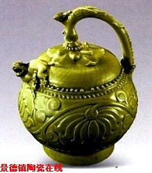 耀州窑位于陕西铜川市,因地属古耀州得名,也叫铜川窑。北宋耀州窑青瓷的胎子是灰白色,较薄,很坚密;釉子细密,光润,青中闪黄或略闪黄,类似北宋时期的龙泉窑。主要装饰方法是刻花、划花、印花、堆塑等。北宋初期开始出现非常草率的刻花,以后日臻成熟。北宋中期,己采用刻划结合的手法,刻主题纹饰,刀法犀利,线条流畅而奔放;划陪衬纹饰时,纤细如丝,排列有序,整体纹饰层次清楚,繁而不乱,有浅浮雕的装饰效果。北宋晚期盛行在盘、碗内印花,既规整又洁晰。常见纹饰有:缠枝牡丹、缠枝莲、缠枝菊、把莲(一把、两把、三把的都有,有的还印上 "三把莲 "等文宇)、菊瓣、梅花、松树、鹊竹、水草、忍冬、龙纹、凤纹、狮、虎、鹿、犀牛、蛾、飞鹤、游鸭、鸳鸯戏莲、莲池游鱼、水波游鱼、仙人骑鹤、飞天、弥勒佛、婴戏等。边饰主要是莲瓣纹、回纹,也有堆贴雕塑龙、兽、力士、猴、荷叶、人物等。