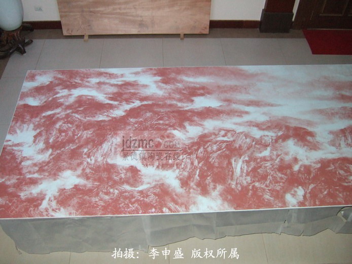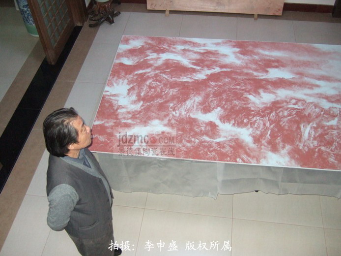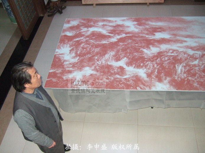 这块瓷板上,连我都分辨出来到底是用了什么,有新彩,有粉彩,还有自己调制的彩,五花八门;绘画的时候,用抹布,肥皂,甘蔗无所不用其极;用樟脑油,香胶水,松节油,煤油,乳香浊,老油,胶水,水等.利用油,水互相排斥,又制造溶剂互相渗透的效果.当然,在这份用心的作品之后,也许会是一个美仑美奂的山水奇迹。但是,这一切,都还得等烧制出来后的效果。