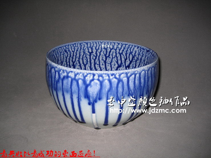 这一件树纹釉的钵,烧制温度是1310摄氏度,还原气氛。这种釉要喷的很厚重才能有着流动的效果,但是如果过厚就会出现大量过度流淌现象,十分难以掌握。这种釉不能和其他釉体搭配,我就调和的使用了一下,结果出现树纹釉的剥离现象。这个钵的失败之处:釉体过厚,钵内淤积严重。外面出现色釉玻璃的现象。