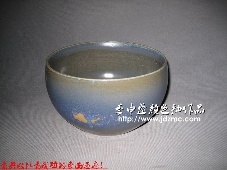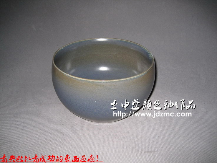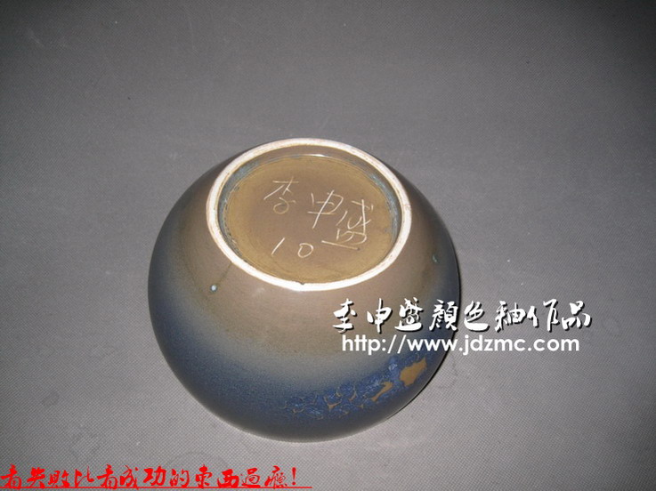 这个钵出问题出在釉体,也可能是窑火位置的原因。本来是一件比较成功的作品,色泽亚光,蓝色星点状影射其中。可惜在某一部位产生严重的缩釉。如果这些缩釉出现在周国桢老师的动物雕塑上可能很漂亮,可惜,用在钵上,就是问题了。