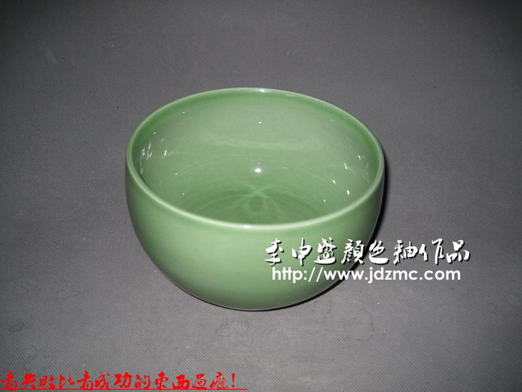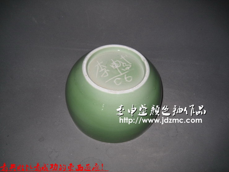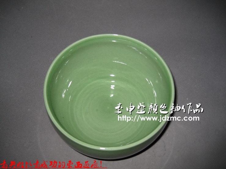 青色系我一直在找,您看到这个青色系是豆青类的,颜色虽然光亮,可惜韵泽度不高。我判断是釉体的厚度不够,于是下面一个钵,我就改用了方式。 作品缺点,坯体上有些毛病,颜色艳丽的色润泽度不高。显得很干瘪。