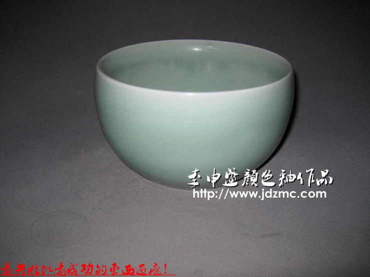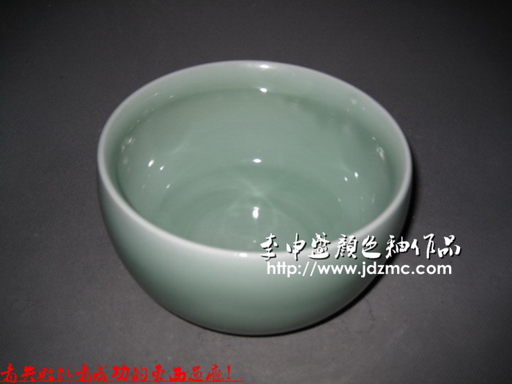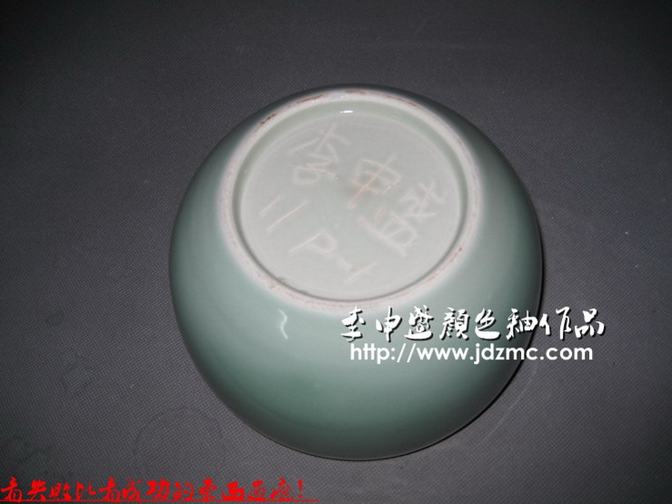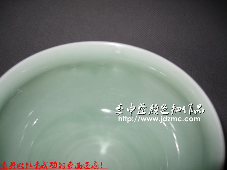 这个钵,想学习龙泉荡釉的方式,将数斤釉全部喷了上去,导致了钵面有些不均。这个钵的喷完了以后,我都没敢动,整个钵体已经湿透了,稍不留神就会将钵体弄破。是放置在施釉台上一天后才送去烧窑。景德镇的青色系和龙泉比最难的是如何将釉层施厚,龙泉的釉体有两个到数个硬币厚,所以润泽度很高。而景德镇的坯体,我目前还没有新的方法如果将釉体施的那么厚,并且能够均匀一致。 问题:1.厚度不均;2.还是润泽度不够;3.坯体有缩釉现象。