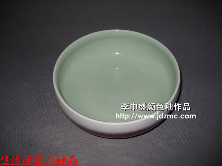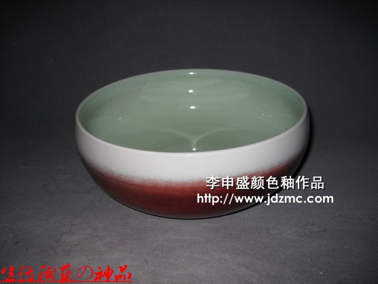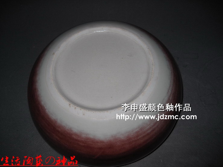 这件综合颜色釉作品为外壁郎红,内壁影青。之所以这样制作,是想将郎红的效果显现出来。只是第一次使用,感觉郎红还是比较难以控制的,其流动性和挥发性不好控制。