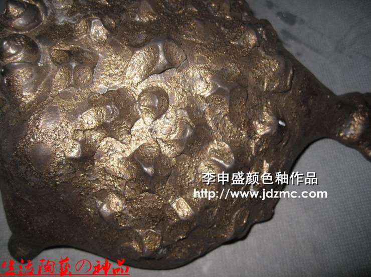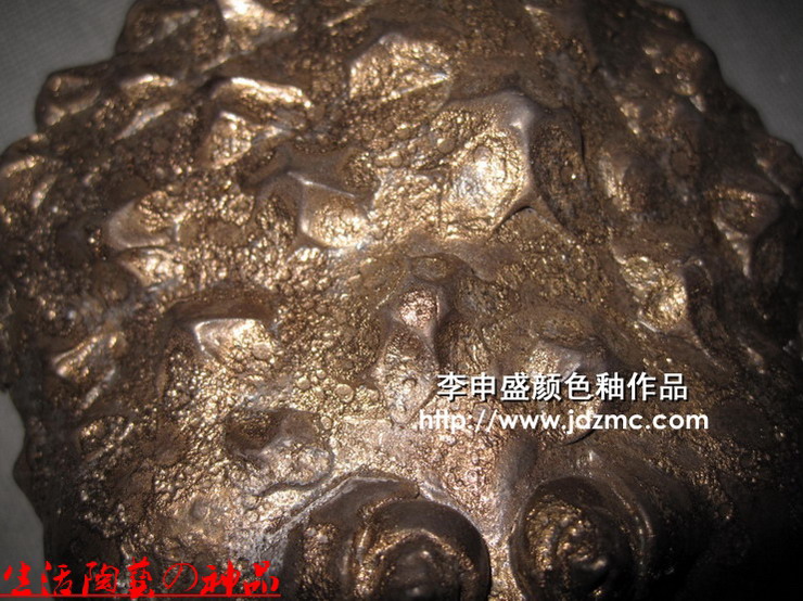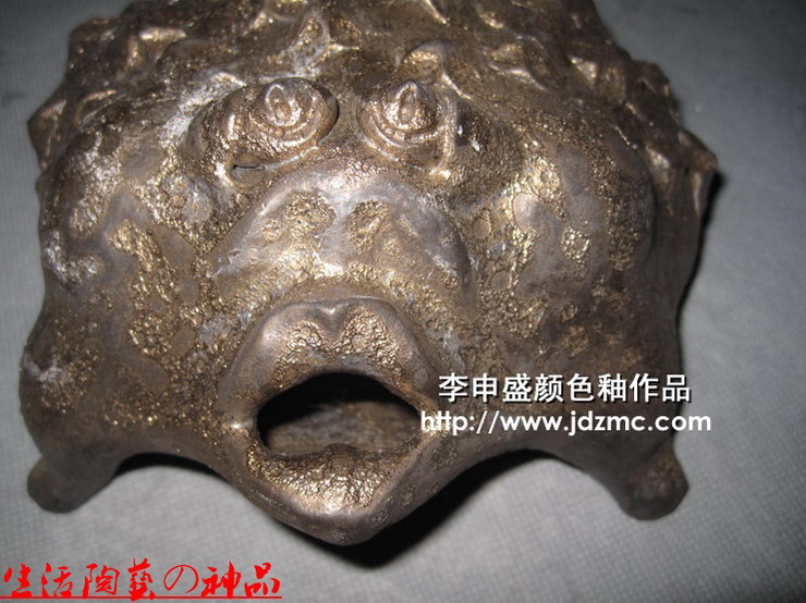 这是笔者的作品--金铜釉。研究耗时一年之久,釉体为高温单色釉,表面有微凸饰纹,其釉面为金属铜化合物,釉质厚,易流淌、不均匀,半途凝结,这些有着向宋瓷靠拢的特征。观釉色,似金似铜,微凸纹饰窑窑不一,色彩均有不同。如为钵形,纹理凝结成字形,如神符一般。击之,闻声有金属之音,音色如磬,古韵悠长,有类似铜磬之美。如为雕塑,高贵凝重,釉中肌理变化神妙莫变。今天展示的只是金蟾一只而已,还有那神妙的钵体因为保密原因暂不公布。此金蟾坯体为全手工制作,独一无二。今天展示为首件,下午刚刚从窑里拿出,已被一位艺术家强打扼要的要走了。其成品身上您可以观看到这种釉体各种神秘之处,如身上的自然釉体形成的的仿生疙瘩,将景德镇高温色釉仿生能力给予了极高的诠释。正面蟾蜍嘴巴两边的纹理形成了两“字”,其玄妙之处直接可见,通体金色,高温凝结,恒古不变。(了了亭·李申盛/文)