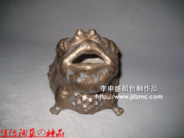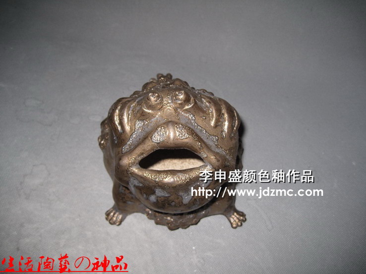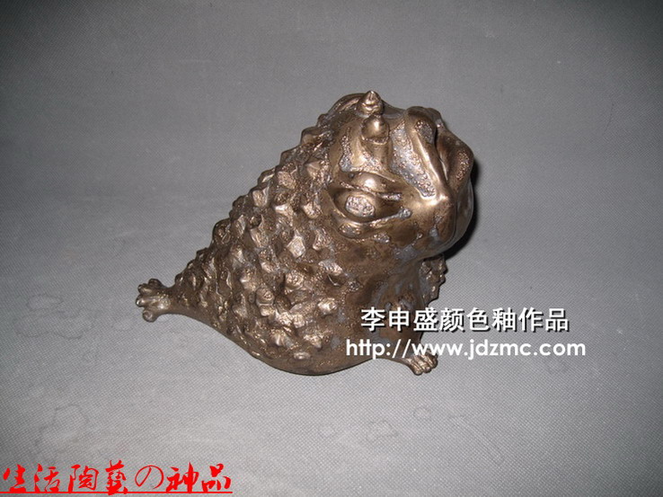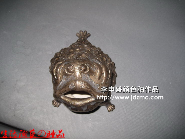 这是第二件三足金蟾作品,依然使用的是金铜釉。是鱼林和我共同设计,金蟾坯体为全手工制作由他制作,我协助改进,釉体的烧制就是我自己的那份了。每一个金蟾独一无二。只是形态上过于个性表现了,对神态的动作捕捉还有一定理解距离。倒是这一件是我放在店里面镇镇的,喜气,又大,换成了立状,感觉还是很不同的。明年过完年以后,和鱼林在好好搞搞。这件成品身上您可以观看到这种釉体各种神秘之处,如身上的自然釉体形成的的仿生疙瘩,将景德镇高温色釉仿生能力给予了极高的诠释。玄妙之处直接可见,通体金色,高温凝结,恒古不变。(了了亭·李申盛/文) 解释: