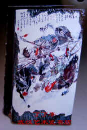《三英战吕布》综合装饰镶器作品表现的是《三国演义》中的刘备三兄弟合力战吕布的故事。画面上四员战将骑着战马,须发飞动,怒目相视,各自挥舞着手中兵器奋力拼战,欲将对手生擒或置于死地。此时,战马的嘶鸣声,战将的怒吼声,剑戟的碰撞声,与英雄的神、气、韵、势和谐一体,产生出强大的艺术感染力和震撼力。"燕人张翼德手持丈八蛇矛抢阵前,恼起关云长青龙宝刀灿霜雪,枭雄玄德掣双锋,吕布力穷无路走,倒拖画戟走赤兔,翻身飞上虎牢关"的脍人耳目的战争场景被刻划得酣畅淋漓,展示出一种粗犷、豪放、刚劲的力量美,令人叹为观止。象这样选择以中国古典文学和古典诗词中的精华片段为题材的陶瓷作品摆满支架。如《桃园结义》、《三顾茅庐》、《共读西厢》、《过故人庄》、《长干曲》等陶瓷作品以洒脱的造型、夸张的手法、色设的恰到好处,集中地展示出中国古典文学艺艺术的内涵美,不由得使我对这位古典文学题材陶艺作品的创作者、职业陶人王品刚先生增添了几分敬意。