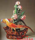 色彩艳丽的锦鸡,浓妆淡抹的牡丹,青翠欲滴的竹枝,姿态奇巧的山石,构筑了吉祥、安康、富贵、美好的景观。锦鸡、牡丹、竹片、枝干纯手工捏塑,精细无比。整个作品构思巧妙,拙朴与灵巧相合,动感与感情相生,体现了作者深厚的传统捏塑表现功力。 |
