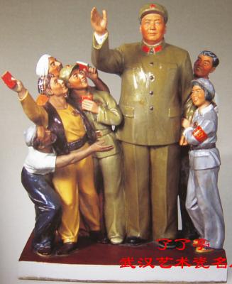 这是“文化大革命”历史背景下的大型组雕之一,共分十组,表现了全世界无产者的革命热情。中心人物毛泽东身着军装,端庄、高大、慈祥,作挥手式。工、农、兵、学生鹤少数民族代表以及亚非拉国家人民手举“红宝书”簇拥其旁,情绪激昂,表情热烈,喜悦崇敬心情溢于言表。该组瓷雕具有很强的时代性。 |