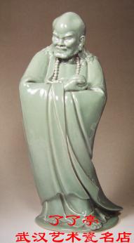 赤足立式,左手拢袖,右手托钵,作观物状停步。达摩宽额露顶,卷发披肩,佛珠垂胸,意志坚定。人物形象写实传神,刻画生动。通体施豆青釉,光洁沉稳。衣纹以板块线形塑造,概括提炼,简洁明了。表现了达摩立于江岸,意欲渡江的情景。