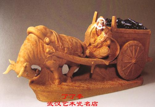 卖炭翁是唐代诗人白居易笔下的人物。作者选择“牛困人饥日已高,市南门外泥中歇”的诗句进行创作,老翁的两鬓苍白,身衣正单,牛困人饥均展现眼前,表现了古代底层劳苦人民的生活情景,作品施黄珍珠釉老者头部涩胎加彩,鬓须留白,以黑釉表现木炭,真实而生动。
