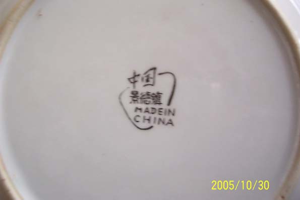 | 中国景德镇、英文MADE IN CHINA 高白釉描金全白盘的底款,74年 | |||||