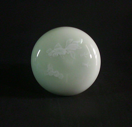 | 色釉(豆青)釉中(下)堆白雕金鱼纹印合 | |||||