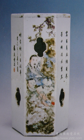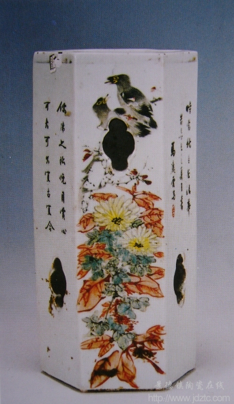 | 马庆云《爱鹅图》浅降彩六方镂空帽筒 | |||||