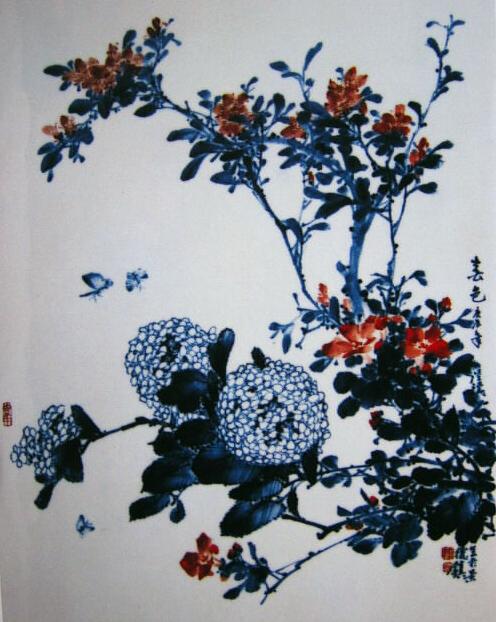 长方形,板面平整光洁。画面采用中国画构图,画法兼工带写,构图疏密得当,青花呈色沉稳。浓郁中有变化的青花叶片,衬托着锦簇团花,花丛中几只飞舞的彩蝶,将画面点缀得春意浓浓。
