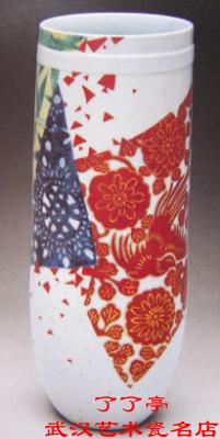 直口,筒腹,收足,造型简练。画面吸收了中国民间蓝印花布和剪纸图案的特点,形式新颖,蓝与红交相辉映,典雅素净,体现出作者深厚的艺术修养。