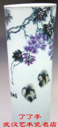 敞口,筒腹,连底圈足,。绘小鸡、紫藤。小鸡的描绘用笔细腻,惟妙惟肖,神形活泼,煞是可爱;紫藤色调艳丽,与素雅的枝叶形成对比;画面布局合理,主体突出,表现出一种请逸恬静的境界。
