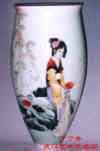 折口、收肩、鼓腹、圈足。瓶体主面绘古装仕女,并配秀石、花木,仕女手持红叶,形象娇美,体态婀娜,衣饰线条流畅,色彩华丽。为突出人物形象,作者将背景事物处理的比较淡雅,加强了画面的空间层次,显示了作者粉彩仕女画的功力。