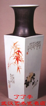 圆撇口,长颈,方肩,平肩微折。瓶体呈四方直简形,是谓"天圆地方"瓶,造型古朴端庄。器身四面分别以红彩、墨彩绘梅、兰、竹、菊,画面清丽高雅,用笔简约情练,足见作者深诸以简驭繁之道。肩颈部饰黑色,与腹部白瓷对此强烈,黑白分明,更使整个作品平添几分肃穆孤高的文人气息。