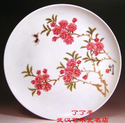 敞口,内底宽平,圈足。作者秉承家传,绘水点桃花,用含有色料的水笔,依次点染茌相应大小的"玻璃白"底色上。作品既有传统填色的粉润效果,又具有画意生动的意味。笔法娴熟,妙趣天成。娇艳欲滴的花朵,充满生气的嫩叶和花丛中嬉戏的蜜蜂,给人一种春光明媚的美好感受。