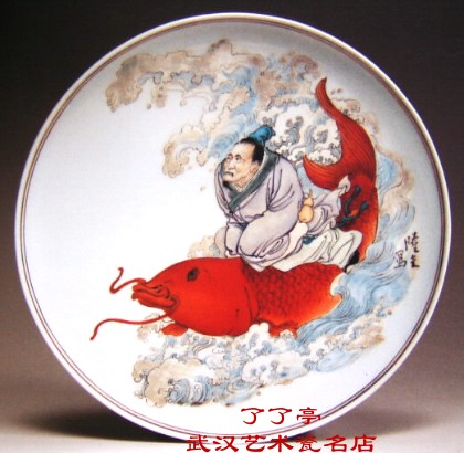 敞□,内底宽平。口沿处饰以双圈金线。波涛汹涌中,琴高跨一红色巨鲤破浪疾行,巨鲤姿态矫健,奋力前行;琴高昂首躬身,双手紧抓鱼鳍,表情焦急;身后水急浪高,画面动感极强,这一切无不渲染了一种紧迫迅急的强烈气氛。